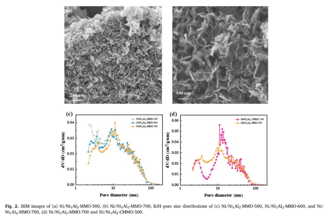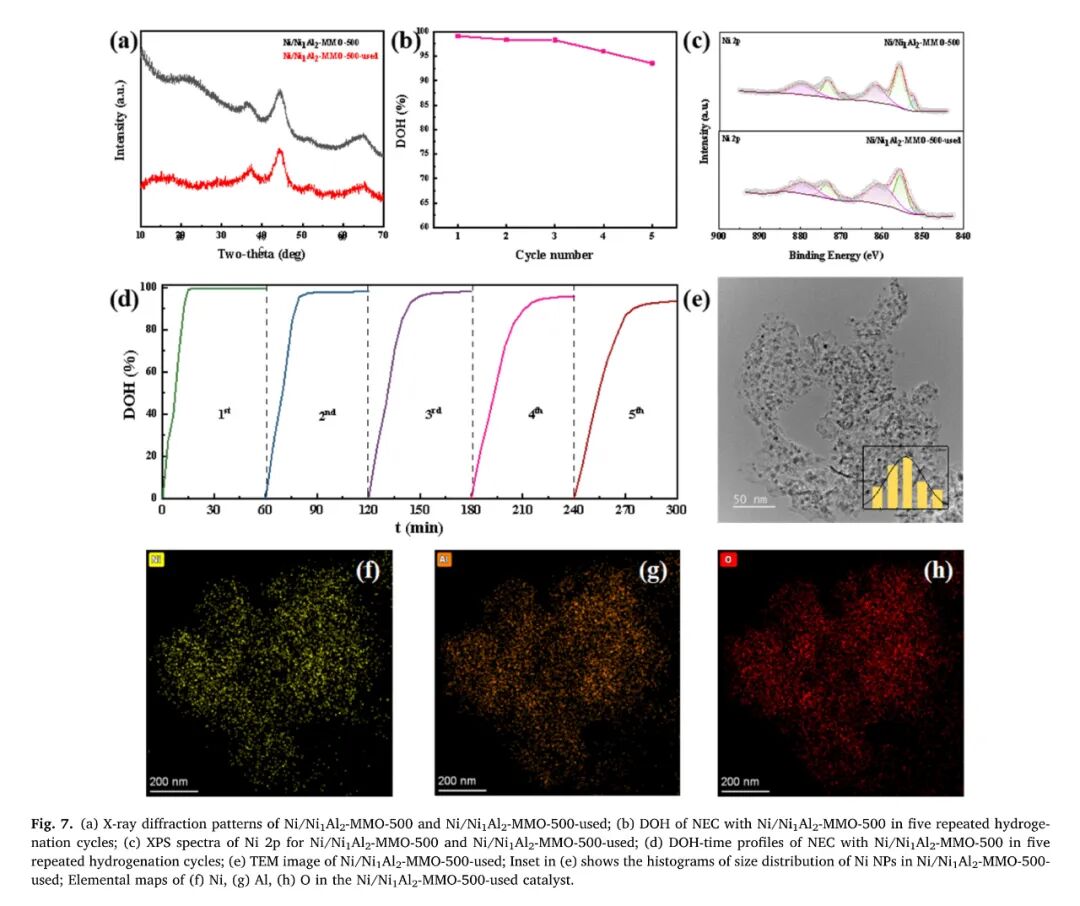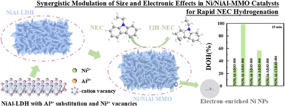 Developing both high-performance and cost-effective hydrogenation catalysts is of strategic importance for advancing the industrialization of liquid organic hydrogen carrier (LOHC) technology. Herein, a series of Ni-based catalysts supported on Ni/Al mixed metal oxides (Ni/NiAl-MMO) are prepared by in-situ topotactic transformation of NiAl-LDH precursors, systematically investigating the synergistic enhancement mechanism regulated by the Ni-Al interfacial interaction and the anchoring effect of the precursor on the size and electronic structure of active metal nanoparticles, as well as their catalytic enhancement effects in N-ethylcarbazole (NEC) hydrogenation. The results show that the optimized Ni/Ni1Al2-MMO-500 catalyst achieved both small size and high electron density of active metal particles under the influence of anchoring effect of the precursor and strong Ni-Al interfacial interaction. The synergistic size and electronic enhancement endow the catalyst with superior catalytic activity in NEC hydrogenation, exceeding all reported Ni-based catalysts and exhibiting catalytic efficiency comparable to that of the widely used commercial precious metal hydrogenation catalyst, 5 wt% Ru/Al2O3, with high catalytic performance sustained across five NEC hydrogenation cycles.